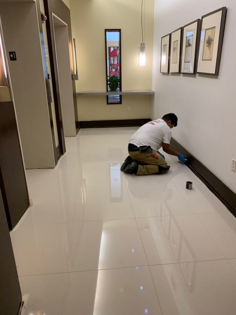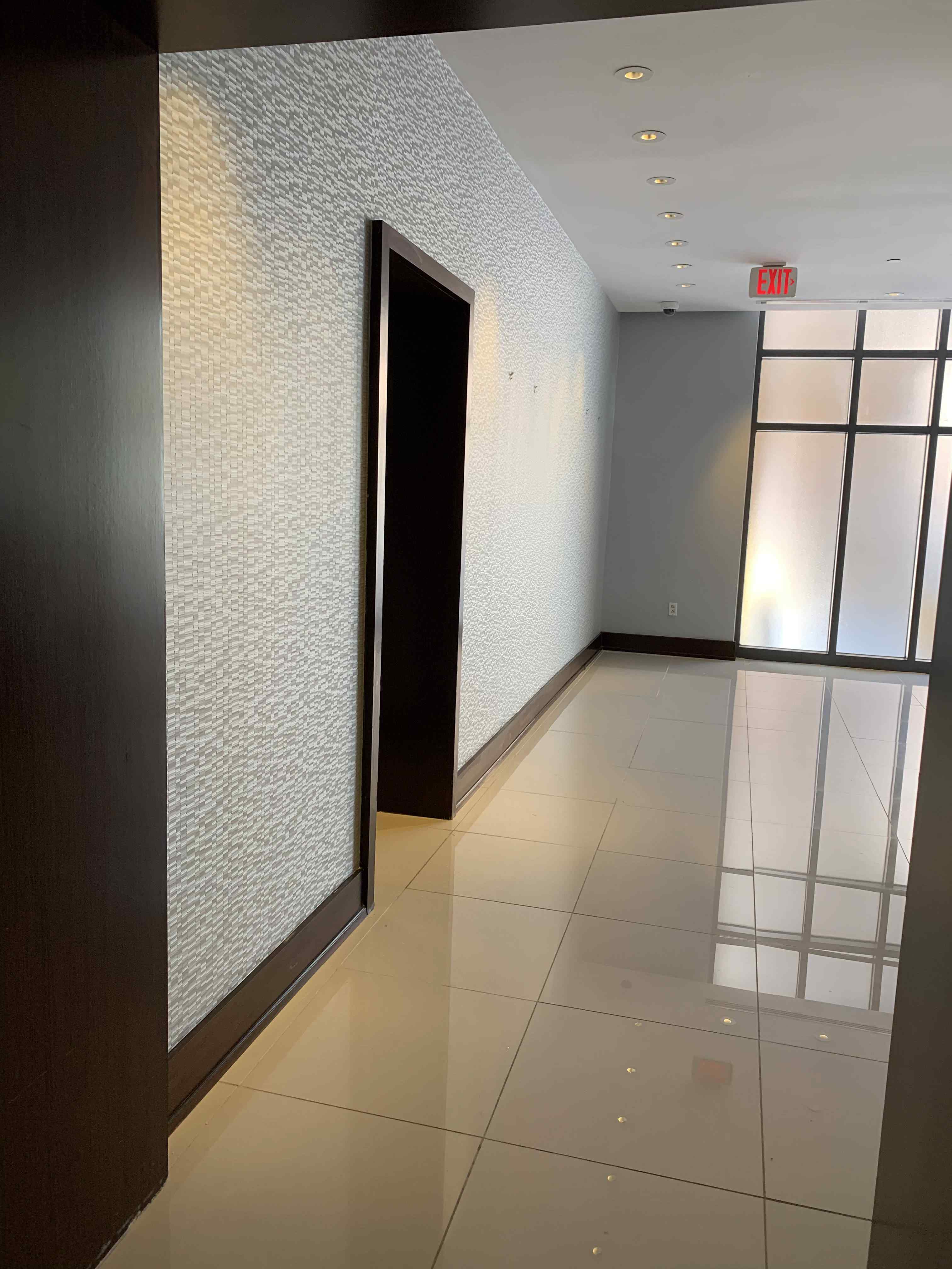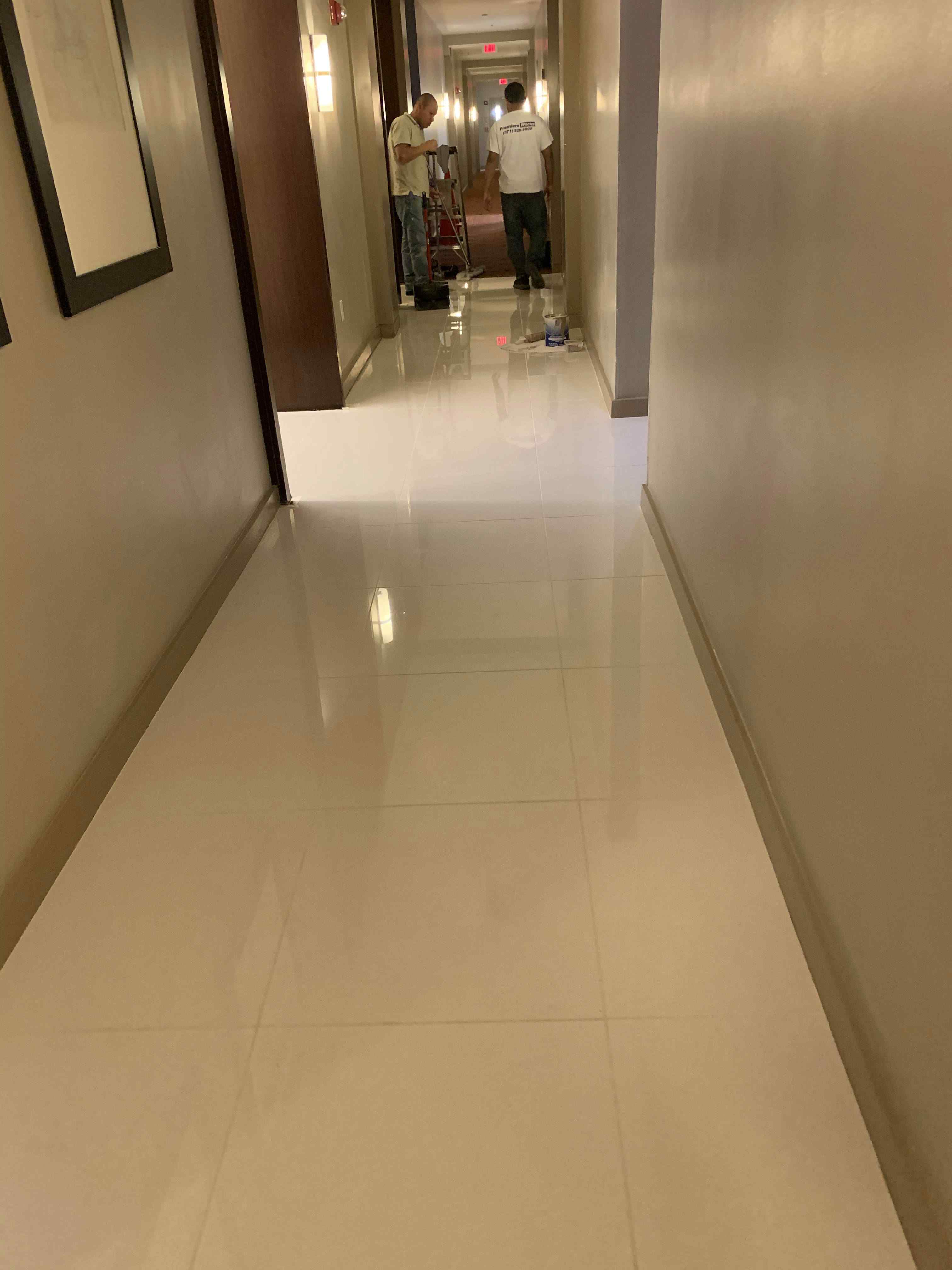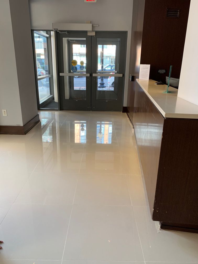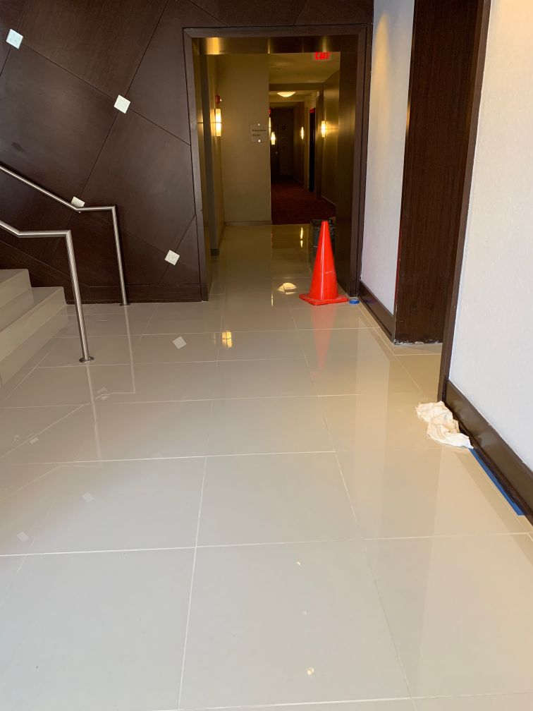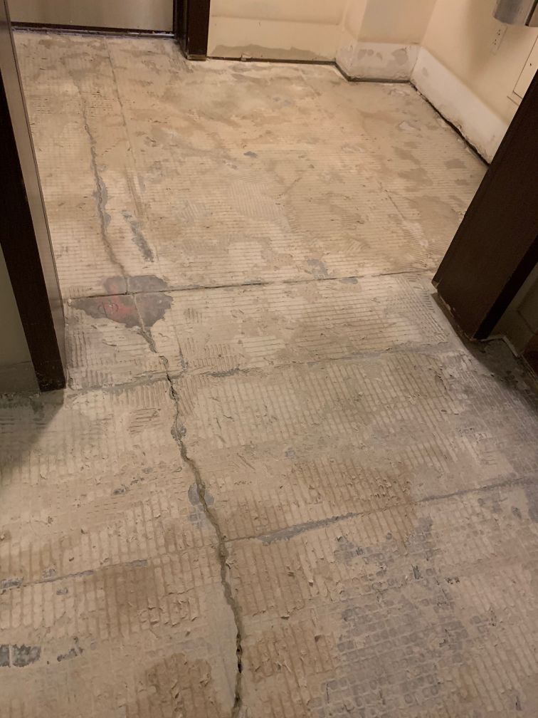 In addition to the flawed contractor and designer problems, the porcelain tile floor throughout the main lobby floor was cracking from the foundation. We repaired the large cracks, leveled the entire main and elevator lobbies, mail room, and common hallways on the first floor. Our technitians also rubberized the floor to protect the tile from future cracks, finishing with the new porcelain tile installation.