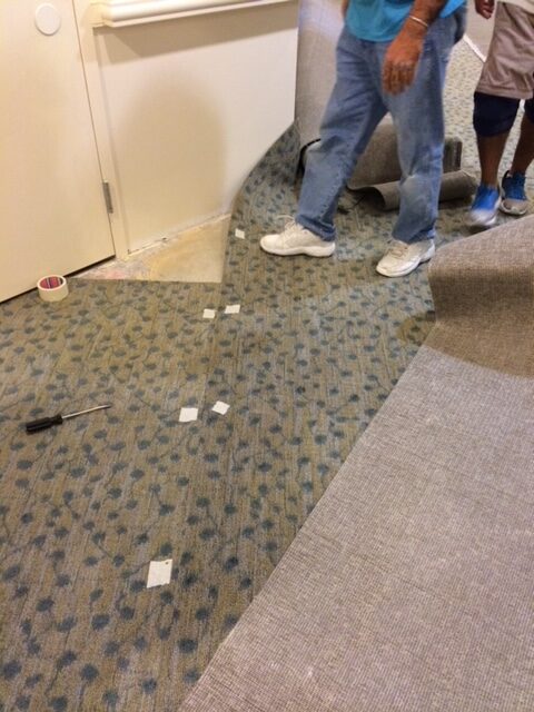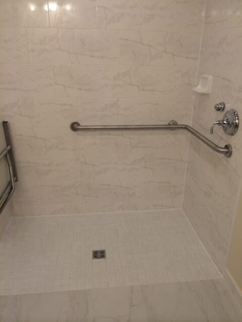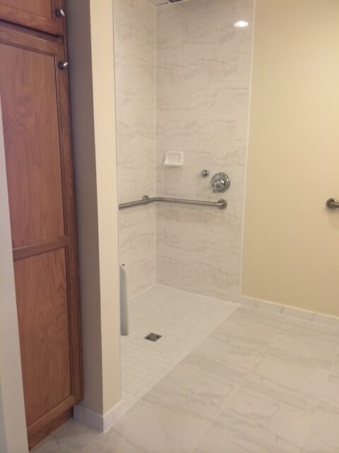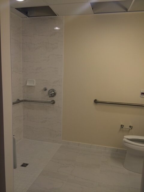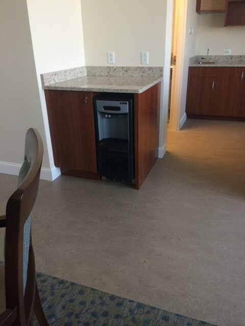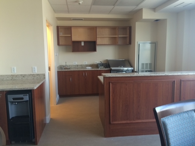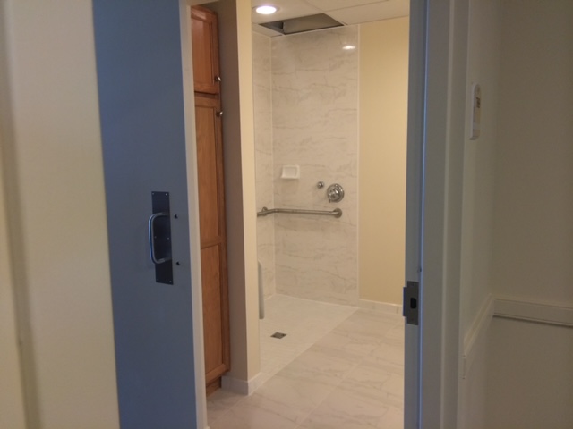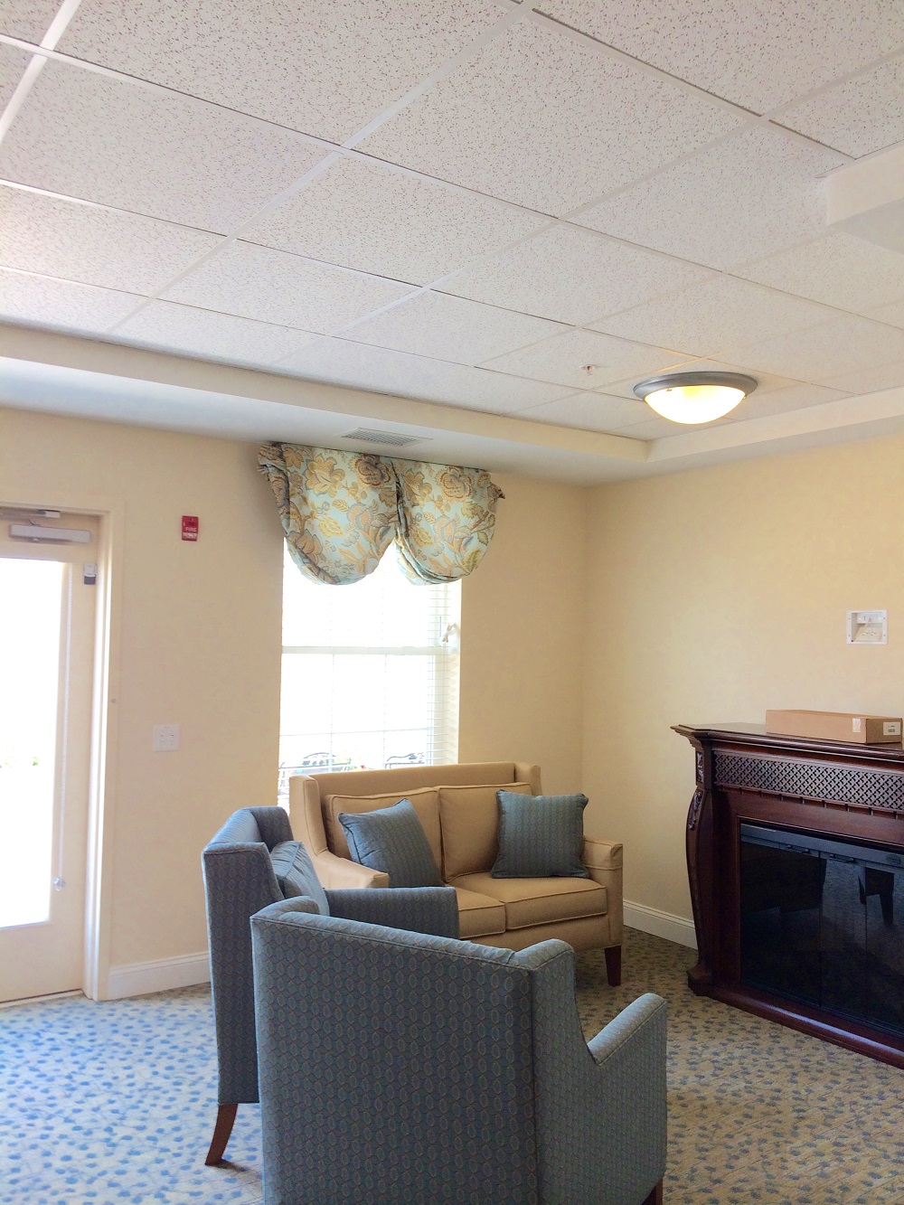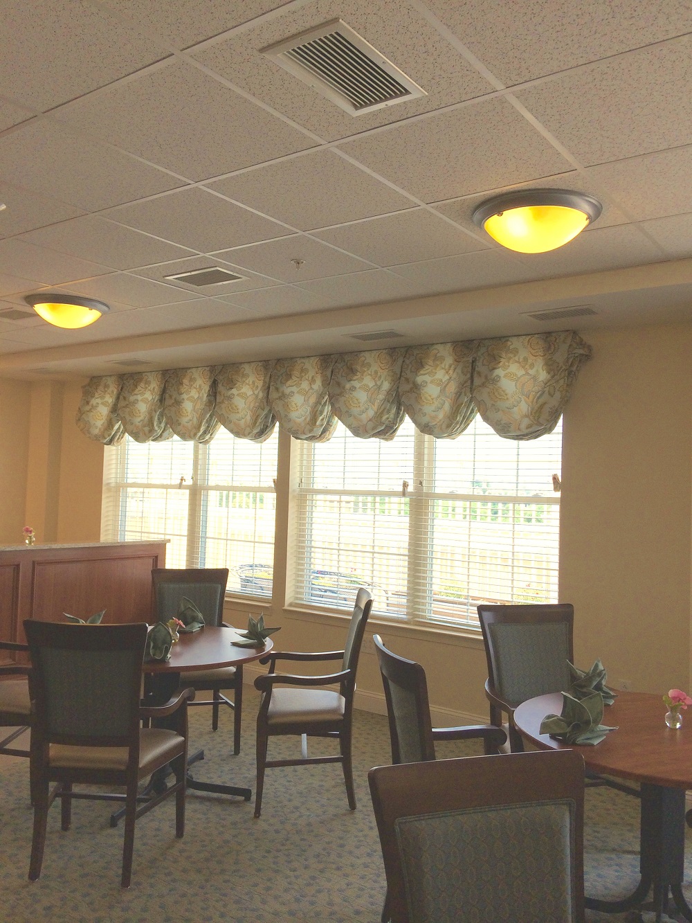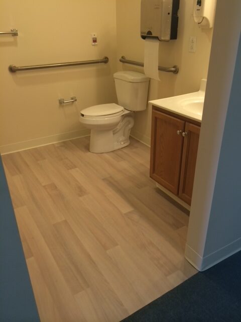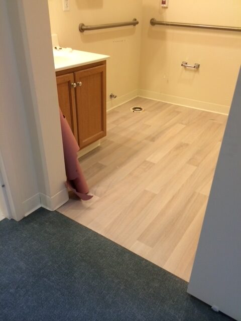 This renovation involved the conversion of 8 residential units to 21 hospital units, 5 new bathrooms and 3 nurses stations for a memory unit on the 7th floor. Interior Design Concept, renovation construction, carpet, porcelain carpet tile for baths, LVT for existing baths and kitchen, fabrics, and window treatments were all provided for and installed by Virginia Commercial Floors, Inc./Atlantic Design Group.